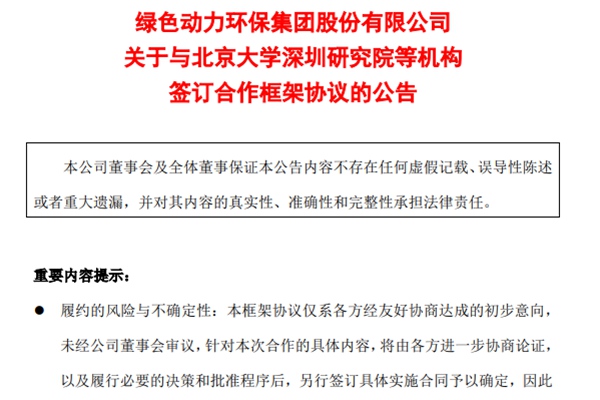 2024年7月24日,绿色动力环保集团股份有限公司发布《关于与北京大学深圳研究院等机构签订合作框架协议的公告》。公告显示,绿色动力2024年7月23日在广东省深圳市与北京大学深圳研究院、鲲鹏产业源头创新中心(深圳)有限公司及深圳市数据动力科技有限公司签订《合作框架协议》,四方拟在能源产业数字化等方面开展深度合作。 合作目标 1、利...