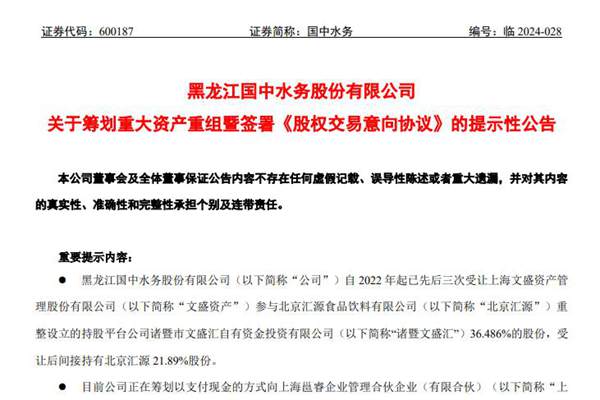 近日,黑龙江国中水务股份有限公司(简称:国中水务)发布公告,称公司拟以支付现金的方式,收购上海邕睿持有的诸暨文盛汇不低于23,222.4万元注册资本,收购完成后公司将累计持有诸暨文盛汇注册资本不低于8.16亿元,占标的公司注册资本的比例不低于51%,从而成为诸暨文盛汇的控股股东及北京汇源食品饮料有限公司的控股股东。受让后间接持有北京汇...