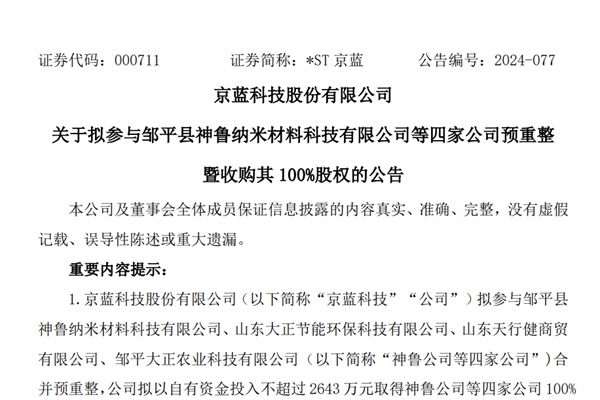2024年7月19日,京蓝科技公告显示,公司拟参与邹平县神鲁纳米材料科技有限公司等四家公司预重整工作,并以以自有资金投入不超过2643万元取得神鲁公司等四家公司100%股权。四家公司分别为:邹平县神鲁纳米材料科技有限公司(下称“神鲁纳米”)、山东大正节能环保科技有限公司、山东天行健商贸有限公司、邹平大正农业科技...