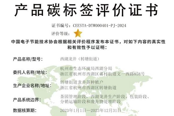 微风拂过茶山,今春明前西湖龙井已经上市。与春茶一道新鲜面市的,还有西湖龙井碳标签。 西湖龙井全生命周期有效减碳 3月29日,2024年西湖龙井春茶季暨上春山吃茶趣活动在龙坞茶镇举行,西湖龙井(转塘街道)碳标签在活动中正式发布,杭州市生态环境局党组成员、二级巡视员马卫国为西湖区转塘街道办事处、西湖区龙井茶产业协会授予了西湖龙井(转塘...