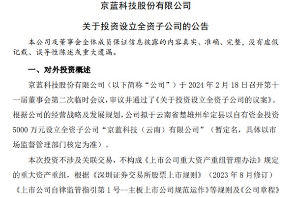 2024年2月20日,京蓝科技发布《关于投资设立全资子公司的公告》,拟以自有资金5000万元投设京蓝科技(云南)有限公司,公司注册地址:云南省楚雄州牟定县庄三片区新兴产业基地(待落实门牌号)。该公司将由京蓝科技100%持股,法定代表人:程桃红。 京蓝科技(云南)有限公司经营范围:靶材及电子专用材料(含薄膜材料、集成电路用材料、半导体...