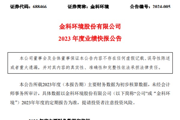 根据金科环境股份有限公司(下称“金科环境”)近日发布的《2023年度业绩快报公告》显示,经公司初步核算,2023年度公司营业总收入55159.98万元,较上年同期减少17.78%;营业利润8663.19万元,较上年同期减少4.15%。基本每股收益0.57元。截至本报告期末,金科环境总资产达约20.87亿元,增长...