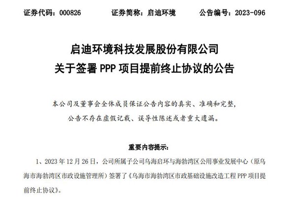 据启迪环境科技发展股份有限公司(简称:启迪环境)近日公告,其所属子公司乌海启环(乌海启环市政工程有限公司)与海勃湾区公用事业发展中心(原乌海市海勃湾区市政设施管理所)签署了《乌海市海勃湾区市政基础设施改造工程 PPP 项目提前终止协议》,宣布提前终止乌海市海勃湾区市政基础设施改造工程 PPP 项目,目前已收到工程款尾款 11000万元...