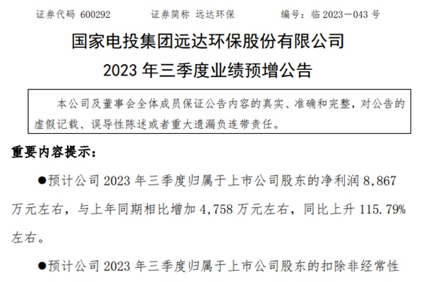 国家电投集团远达环保股份有限公司(下称“远达环保”)于2023年10月10日发布《远达环保2023年三季度业绩预增公告》。业绩预告期间:2023 年 1 月 1 日至 2023 年 9 月 30 日。 公告称,预计公司 2023 年三季度归属于上市公司股东的净利润 8,867万元左右,与上年同期相比增加 4,...