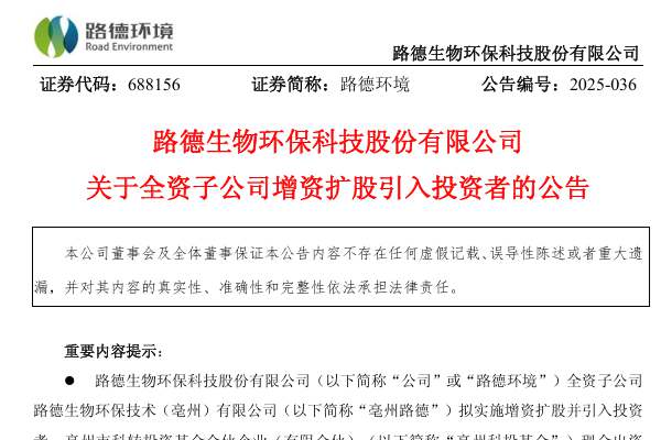 路德生物环保科技股份有限公司(简称:路德环境)近日公告称,全资子公司路德生物环保技术(亳州)有限公司(下称“亳州路德”)拟实施增资扩股并引入投资者,亳州市科转投资基金合伙企业(有限合伙)(下称“亳州科投基金”)现金出资2,000 万元人民币认购亳州路德新增注册资本2,000万元;亳州市生...