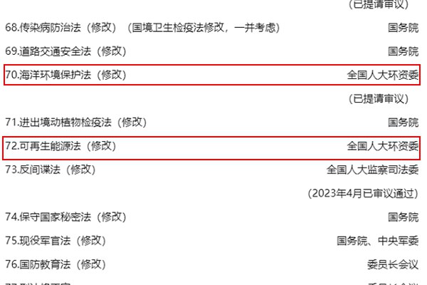 9月7日,新华社受权发布《十四届全国人大常委会立法规划(共130件)》,包括三类立法项目。 其中,第一类项目为“条件比较成熟、任期内拟提请审议的法律草案”共79件,包括能源法、原子能法、可再生能源法、海洋环境保护法(修改)等。第二类项目为“需要抓紧工作、条件成熟时提请审议的法律草案”共...