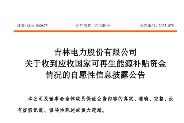 吉林电力股份有限公司(简称:吉电股份)近日公告称,2025年8月,公司所属单位共收到国家可再生能源补贴资金9.13亿元。自2025年1月1日至2025年8月31日,公司共收到国家可再生能源补贴资金12.71亿元,较去年同期增加154.2%,占2024年全年收到国家可再生能源补贴资金的135.36%。 吉电股份表示,上述国家可再生能源...