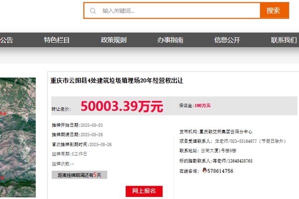 近日,从重庆产权交易网获悉,重庆市云阳县4处建筑垃圾填埋场20年经营权出让,转让底价为50003.39万元,项目转让方为云阳县住房和城乡建设委员会。 该项目系位于重庆市云阳县黄岭工业园区、莲花村、水口镇的4处建筑垃圾填埋场20年经营权出让,预估占地面积为2296.78亩,设计回填方量为6925.84万·m³。...