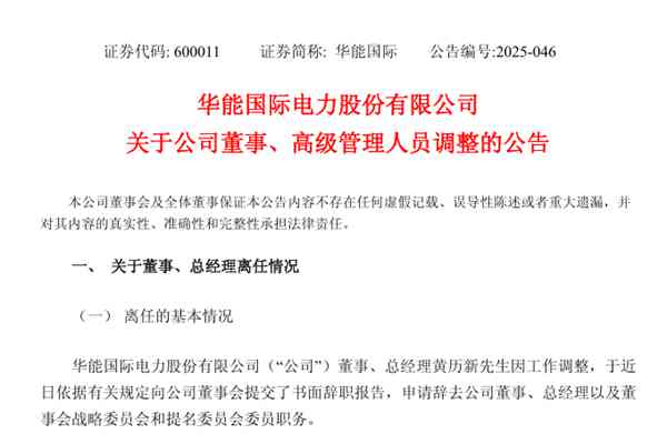 华能国际电力股份有限公司(简称:华能国际)公告称,公司董事、总经理黄历新先生因工作调整,于近日依据有关规定向公司董事会提交了书面辞职报告,申请辞去公司董事、总经理以及董事会战略委员会和提名委员会委员职务。图源:华能国际公告 华能国际于2025年7月29日召开第十一届董事会第十四次会议,审议通过《关于增补公司董事的议案》,同意提名刘安...