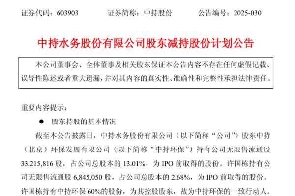 中持水务股份有限公司(简称:中持股份)公告称,公司股东中持(北京)环保发展有限公司(下称“中持环保”)、许国栋拟通过上海证券交易所交易系统以集中竞价、大宗交易的方式减持公司股份不超过7,659,584股,即减持股份不超过公司股份总数的3.00%。 截至本公告披露日,中持环保持有中持股份无限售流通股33,215...