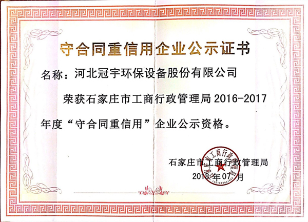 恭喜冠宇环保获得2016-2017年度“守合同重信用”企业公示资格。...