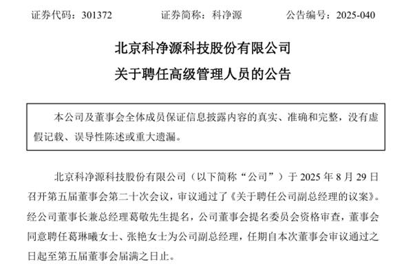 北京科净源科技股份有限公司(简称:科净源)近日公告称,公司审议通过了《关于聘任公司副总经理的议案》。经公司董事长兼总经理葛敬先生提名,公司董事会提名委员会资格审查,董事会同意聘任葛琳曦女士、张艳女士为公司副总经理,任期自本次董事会审议通过之日起至第五届董事会届满之日止。 其中,葛琳曦女士1992年出生,为科净源实际控制人葛敬和张茹敏...