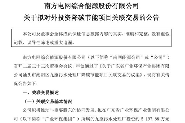 2025年06月10日,南方电网综合能源股份有限公司发布《关于拟对外投资降碳节能项目关联交易的公告》。图源:南网能源公告 南方电网综合能源股份有限公司召开二届三十三次董事会会议,审议通过了《关于广东省广业环保产业集团有限公司汕头市潮阳区九座污水处理厂降碳节能项目关联交易的议案》。 公司积极推动与重要股东的协同发展,拟在广东省广业环...