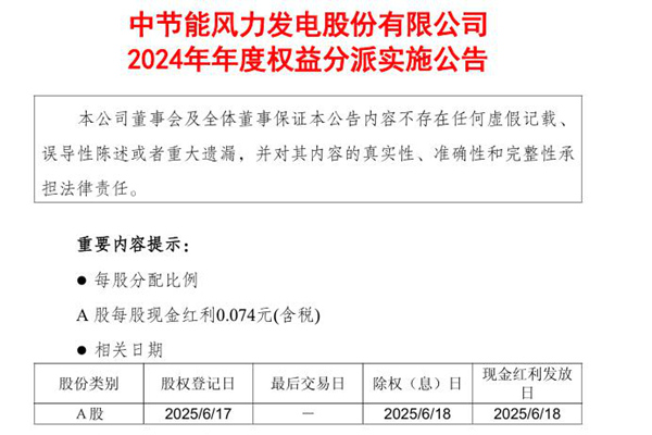 2025年06月12日,中节能风力发电股份有限公司发布《2024年年度权益分派实施公告》。图源:节能风电公告 本次利润分配以方案实施前的公司总股本6,473,390,050股为基数,每股派发现金红利0.074元(含税),共计派发现金红利479,030,863.70元。 申明:本站发布此信息的目的在于传播更多信息,与本站立场无关。并...
