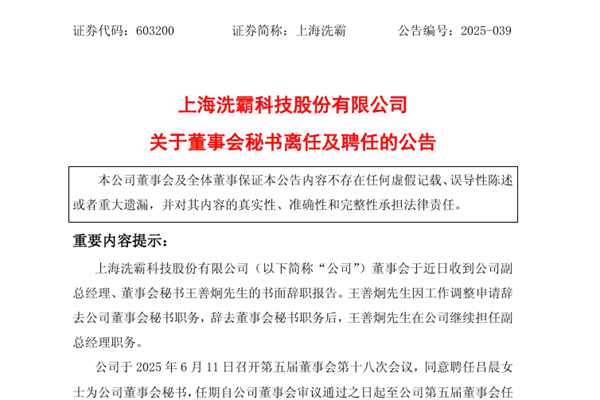 上海洗霸科技股份有限公司(简称:上海洗霸)公告称,公司近日收到副总经理、董事会秘书王善炯先生的书面辞职报告。王善炯先生因工作调整申请辞去公司董事会秘书职务,辞去董事会秘书职务后,王善炯先生在公司继续担任副总经理职务。 经上海洗霸董事会提名委员会审核,同意聘任吕晨女士为公司董事会秘书,任期自公司董事会审议通过之日起至公司第五届董事会任...