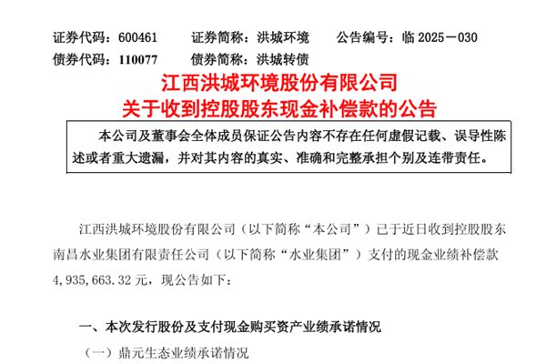 近日,江西洪城环境股份有限公司(简称:洪城环境)公告称,公司已收到控股股东南昌水业集团有限责任公司支付的现金业绩补偿款4,935,663.32 元。 据悉,在2021年8月11日,洪城环境发布公告称,以发行股份及支付现金的方式购买水业集团持有的鼎元生态100%股权。鼎元生态100%股权的交易作价9.441亿元。依靠此次交易,洪城环境...