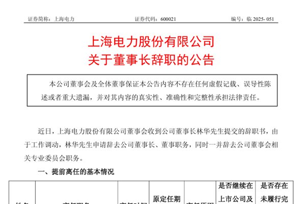 上海电力股份有限公司(简称:上海电力)近日公告称,公司已收到董事长林华先生提交的辞职书,由于工作调动,林华先生申请辞去公司董事长、董事职务,同时一并辞去公司董事会相关专业委员会职务。图源:上海电力公告 申明:本站发布此信息的目的在于传播更多信息,与本站立场无关。并且郑重提示所有阅读者,股市有风险,投资需谨慎,本文不作为任何投资的参考...