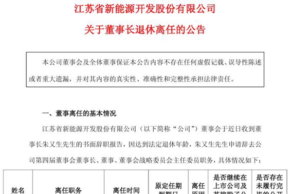 2025年05月30日,江苏省新能源开发股份有限公司发布《关于董事长退休离任的公告》。图源:江苏新能公告 因达到法定退休年龄,朱又生先生申请辞去公司第四届董事会董事长、董事、董事会战略委员会主任委员职务。 申明:本站发布此信息的目的在于传播更多信息,与本站立场无关。并且郑重提示所有阅读者,股市有风险,投资需谨慎,本文不作为任何投资...