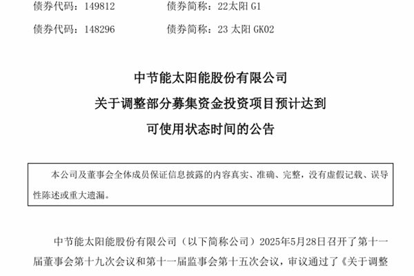 5月29日,中节能太阳能股份有限公司(简称:太阳能)发布《关于调整部分募集资金投资项目预计达到可使用状态时间的公告》。 公告显示,太阳能旗下7个光伏项目均延期投产,总装机容量达1.15GW。具体如下↓ 察布查尔县25万千瓦/100万千瓦时全钒液流电池储能+100万千瓦市场化并网光伏发电项目一期300MW项目,目前已全部建...