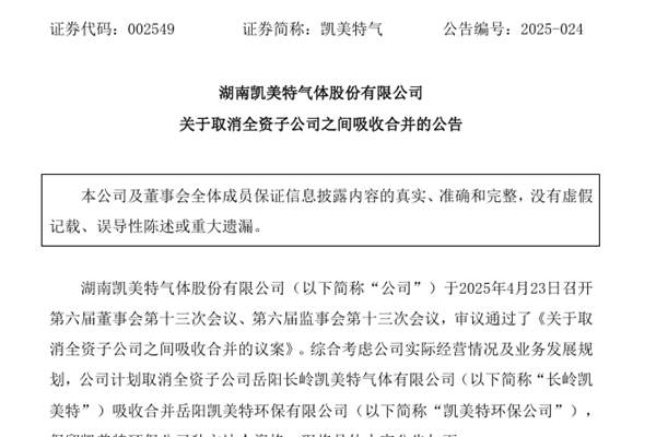湖南凯美特气体股份有限公司(简称:凯美特气)近日公告称,综合考虑公司实际经营情况及业务发展规划,经审慎研究,公司计划取消全资子公司岳阳长岭凯美特气体有限公司(下称“长岭凯美特”)吸收合并岳阳凯美特环保有限公司(下称“凯美特环保公司”),保留凯美特环保公司独立法人资格。 据悉,凯美特气曾...