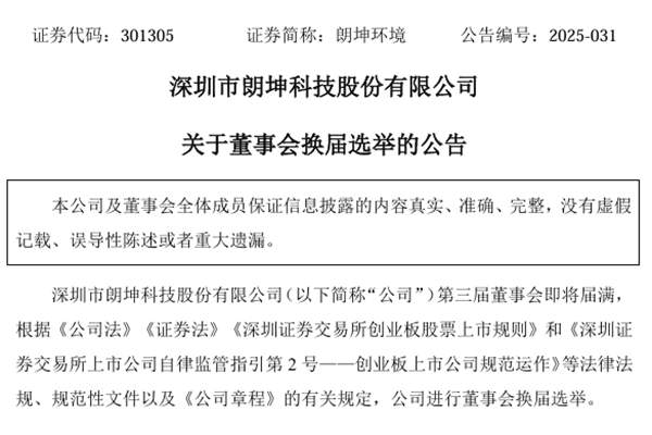深圳市朗坤科技股份有限公司(简称:朗坤环境)近日发布关于董事会换届选举的公告。日前,朗坤环境董事会提名陈建湘先生、杨友强先生、周存全先生为第四届董事会非独立董事候选人;公司董事会提名冀星先生、张田余先生、陈慈琼女士为第四届董事会独立董事候选人,其中陈慈琼女士为会计专业人士。现在,董事会提名委员会对上述候选人的任职资格进行了审核并同意,...