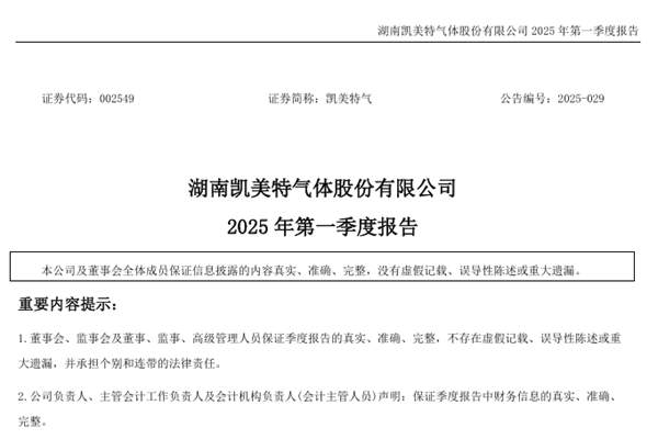 湖南凯美特气体股份有限公司(简称:凯美特气)近日发布《2025 年第一季度报告》。报告期内,凯美特气实现营收约1.63亿元,同比增加13.79%;归属于上市公司股东的净利润约3175万元;基本每股收益0.0457元。上年同期,凯美特气营收约1.43亿元;归属于上市公司股东的净利润亏损约7560万元;基本每股收益亏损0.1087元。图源...