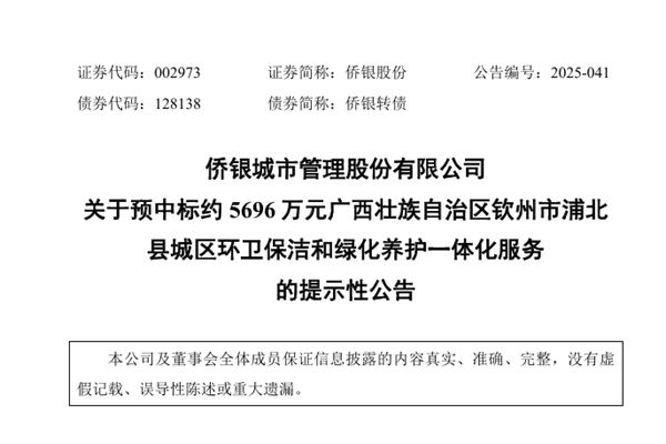侨银城市管理股份有限公司(简称:侨银股份)近日公告称,公司预中标浦北县城区环卫保洁和绿化养护一体化服务,投标报价56,955,126.69元(三年)。 项目详情 1.项目名称:浦北县城区环卫保洁和绿化养护一体化服务; 2.采购人:浦北县综合行政执法局; 3.采购代理机构:广西华霖招标有限公司; 4.投标报价:首年报价18,9...