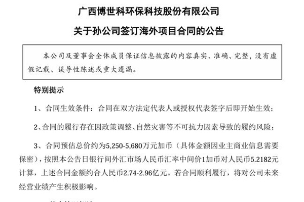 2025年04月15日,广西博世科环保科技股份有限公司发布《关于孙公司签订海外项目合同的公告》。图源:博世科公告 近日,广西博世科环保科技股份有限公司的全资孙公司RemedX Remediation Service Inc.与某大型油气公司签订了《污染场地土壤修复服务合同》,合同预估总价约为人民币2.74-2.96亿元(具体金额因业...