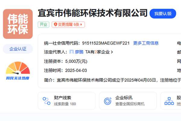 4月3日,宜宾市伟能环保技术有限公司注册成立,法定代表人为廖鹏,注册资本为5000万元,经营范围包含:固体废物治理;再生资源回收(除生产性废旧金属);再生资源销售;新材料技术研发;生态环境材料制造;生态环境材料销售;建筑砌块制造;建筑砌块销售;轻质建筑材料制造;轻质建筑材料销售;砼结构构件制造;砼结构构件销售;水泥制品制造;水泥制品销...
