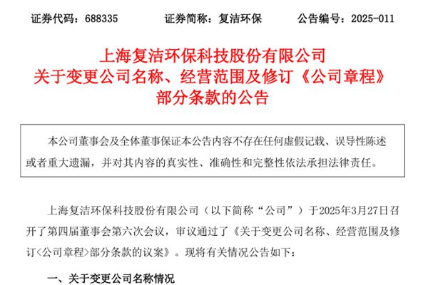 上海复洁环保科技股份有限公司(简称:复洁环保)3月29日发布关于变更公司名称、经营范围及修订《公司章程》部分条款的公告。据悉,为更全面、客观、准确地反映公司业务现状、产业布局及未来发展规划,进一步强化企业核心价值与品牌形象,复洁环保拟对公司名称进行变更,公司证券简称及证券代码保持不变。 中文名称由“上海复洁环保科技股份有...