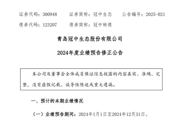青岛冠中生态股份有限公司(简称:冠中生态)近日发布《2024年度业绩预告修正公告》。图源:冠中生态公告 冠中生态表示,近期,公司陆续取得关于青岛市蓝鳌路两侧废弃矿山地质环境治理工程设计施工总承包、青岛市西海岸新区矿山地质环境生态修复工程、青岛市市北区浮山防火通道(绿道)改造提升项目审计单位发给各项目业主单位的工程造价审计结果,经核算...