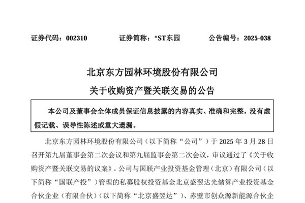 3月28日,北京东方园林环境股份有限公司(简称:*ST东园,下称“东方园林”)公告称,公司与国联产业投资基金管理(北京)有限公司(下称“国联产投”)管理的私募股权投资基金北京盛翌达光储算产业投资基金合伙企业(有限合伙)、赤壁市创众源新能源合伙企业(有限合伙)签署《股权转让协议》,收购其共...