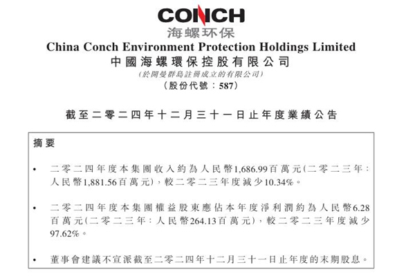 2025年03月24日,中国海螺环保控股有限公司发布《截至二零二四年十二月三十一日止年度業績公告》。图源:海螺环保公告 报告期内,公司收入约为16.87亿元,较2023年减少10.34%。净利润方面,公司权益股东应占净利润约为628万元,较2023年减少97.62%。 分项目看,工业危废处置服务收入同比减少5.61%。 其中一般...
