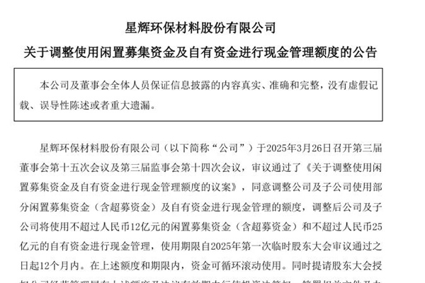 2025年03月27日,星辉环保材料股份有限公司发布《关于调整使用闲置募集资金及自有资金进行现金管理额度的公告》。图源:星辉环材公告 调整后公司及子公司将使用不超过人民币12亿元的闲置募集资金(含超募资金)和不超过人民币25亿元的自有资金进行现金管理,使用期限自2025年第一次临时股东大会审议通过之日起12个月内。 星辉环材筹集募...