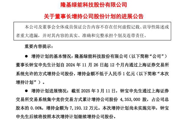 2025年03月12日,隆基绿能科技股份有限公司发布《关于董事长增持公司股份计划的进展公告》。图源:隆基绿能公告 基于对公司未来持续稳定发展的信心和长期投资价值的认可,为维护股东利益,增强投资者信心,隆基绿能科技股份有限公司董事长钟宝申先生计划自 2024 年 11 月 26 日起 12 个月内通过上海证券交易所系统允许的方式增持公...