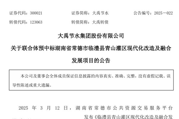 大禹节水集团股份有限公司(简称:大禹节水)近日公告称,全资子公司甘肃大禹节水集团水利水电工程有限责任公司与湖南金德建设有限公司(联合体牵头人)、汇杰设计集团股份有限公司组成的联合体成为临澧县青山灌区现代化改造及融合发展项目第一中标候选人。 项目名称:临澧县青山灌区现代化改造及融合发展项目 招标人:临澧县金惠实业发展有限责任公司 ...