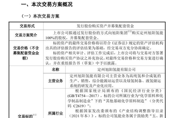 2025年03月13日,北京亿华通科技股份有限公司发布《发行股份购买资产并募集配套资金暨关联交易预案》。图源:亿华通公告 亿华通拟通过发行股份的方式向旭阳集团购买定州旭阳氢能100%的股权,并募集配套资金。 定州旭阳氢能有限公司,主营业务为高纯氢和合成氨的生产、销售,综合能源站运营以及绿氢制备、液氢储运系统的研发及产业化应用。 ...