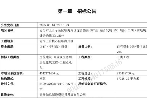 青岛市上合示范区临海片区综合整治与产业融合发展EOD项目二期(南地块)设计采购施工总承包招标,控价944,664,458.07元。 项目概况 项目名称:青岛市上合示范区临海片区综合整治与产业融合发展EOD项目二期(南地块)设计采购施工总承包 项目位置:青岛上合核心区临海片区 &z...