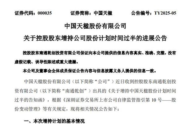 中国天楹股份有限公司(简称:中国天楹)近日公告称,公司控股股东南通乾创投资有限公司(下称“南通乾创”)基于对公司未来持续稳定发展的坚定信心和长期投资价值的认可,同时为了维护广大股东的利益,提升投资者的信心,促进公司持续、稳定、健康发展,计划自 2024 年 11 月 13 日起 6 个月内,通过深圳证券交易所系...