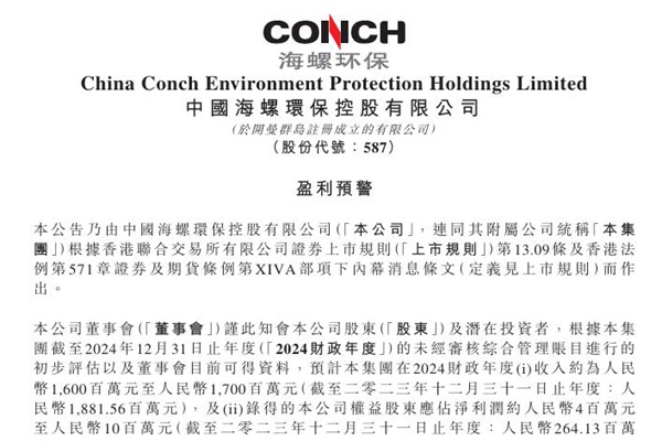 2025年02月18日,中国海螺环保控股有限公司发布《盈利预警》。图源:海螺环保公告 公告称,预计该集团在2024财政年度收入约为人民币16亿元至17亿元(2023年度:约18.82亿元),及取得的公司权益股东应占净利润约人民币400万元至1000万元(2023年度:约2.64亿元)。 董事会认为该预期下降乃主要由于:面对危废处置...