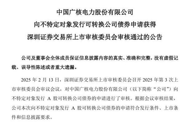2025年02月14日,中国广核电力股份有限公司发布《向不特定对象发行可转换公司债券申请获得深圳证券交易所上市审核委员会审核通过的公告》。图源:中国广核公告 公告表示,公司本次向不特定对象发行 A 股可转换公司债券事项尚需获得中国证券监督管理委员会作出同意注册的决定后方可实施,最终能否获得中国证监会同意注册的决定及其时间尚存在不确...