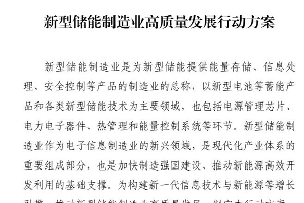 工业和信息化部等八部门关于印发《新型储能制造业高质量发展行动方案》的通知工信部联电子〔2025〕7号 各省、自治区、直辖市、新疆生产建设兵团工业和信息化部门、发展改革委、商务主管部门、教育厅(教委、局)、市场监管局(厅、委)、知识产权局、能源局、消防救援总队: 现将《新型储能制造业高质量发展行动方案》印发给你们,请结合实际认真抓好落实...
