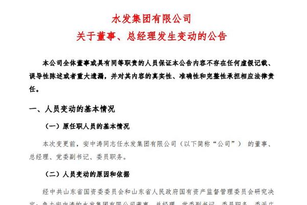 1月26日,水发集团有限公司发布《关于董事、总经理发生变动的公告》,经中共山东省国资委委员会和山东省人民政府国有资产监督管理委员会研究决定:免去安中涛的水发集团有限公司董事、总经理、党委副书记、委员职务,委派庄建为水发集团有限公司董事、总经理。 庄建,男,1974 年 9 月生,大学,会计专业硕士,民革党员,正高级会计师。历任中国重...