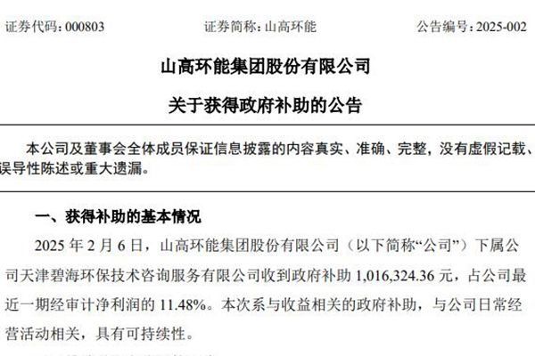 山高环能集团股份有限公司(简称:山高环能)2月7日公告称,公司下属公司天津碧海环保技术咨询服务有限公司收到政府补助 1,016,324.36 元,占公司最近一期经审计净利润的 11.48%。本次系与收益相关的政府补助,与公司日常经营活动相关,具有可持续性。图源:山高环能公告 申明:本站发布此信息的目的在于传播更多信息,与本站立场无关...