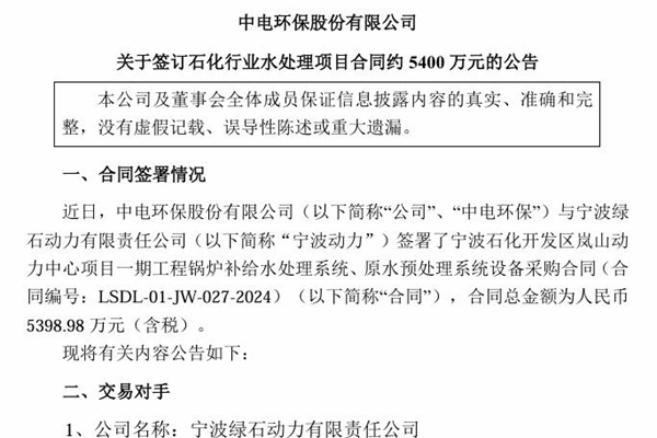 2025年1月22日,中电环保股份有限公司发布《关于签订石化行业水处理项目合同约 5400 万元的公告》。图源:中电环保公告 公告称,中电环保与宁波绿石动力有限责任公司)签署了宁波石化开发区岚山动力中心项目一期工程锅炉补给水处理系统、原水预处理系统设备采购合同(合同编号:LSDL-01-JW-027-2024),合同总金额为人民币5...