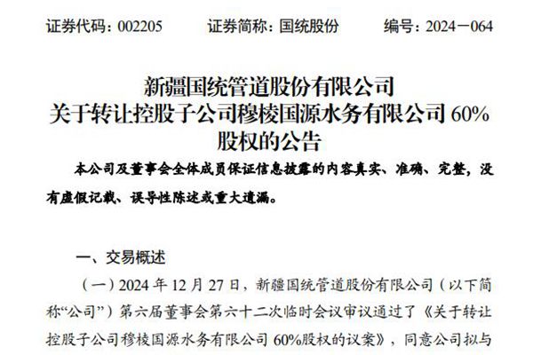 12月31日,新疆国统管道股份有限公司(简称:国统股份)公告称,公司拟与穆棱市水投能源开发有限公司(下称“穆棱水投”)签署《股权转让协议》,转让持有的控股子公司穆棱国源水务有限公司(下称“穆棱国源”)60%股权,转让价格为人民币4,706万元。 转让完成后,国统股份将不再持有穆棱国源的...