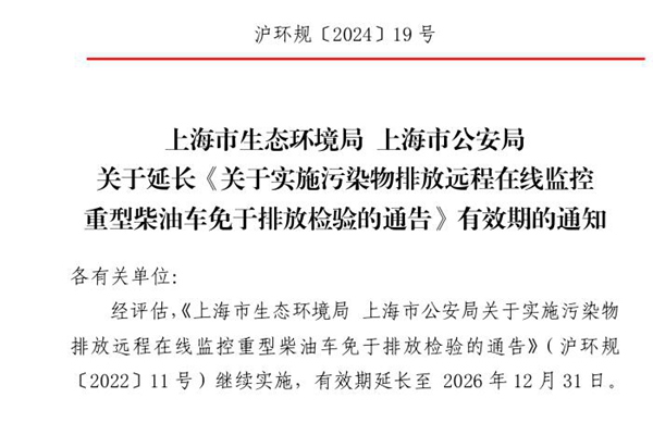 上海市生态环境局 上海市公安局关于延长《关于实施污染物排放远程在线监控重型柴油车免于排放检验的通告》有效期的通知沪环规〔2024〕19号 各有关单位: 经评估,《上海市生态环境局 上海市公安局关于实施污染物排放远程在线监控重型柴油车免于排放检验的通告》(沪环规〔2022〕11号)继续实施,有效期延长至 2026年12月31日。 上海...