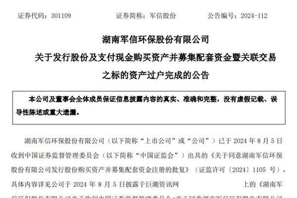 湖南军信环保股份有限公司(简称:军信股份)近日公告称,公司已完成收购湖南仁和环境科技有限公司(简称“仁和环境”)股权的资产过户交割及工商变更登记手续,正式成为仁和环境控股股东。 公开资料显示,军信股份是一家长期致力于环境治理、绿色能源、节能低碳业务的国家高新技术企业和湖南固废处理领域的龙头企业,于2022年在...
