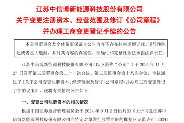 2024年11月28日,江苏中信博新能源科技股份有限公司发布《关于变更注册资本、经营范围及修订《公司章程》并办理工商变更登记手续的公告》。图源:中信博公告 公告显示,中信博向特定对象发行A股股票16,053,790股,发行价格为每股人民币68.60 元,募集资金总额为人民币1,101,289,994.00元。本次发行完成后,公司总股...