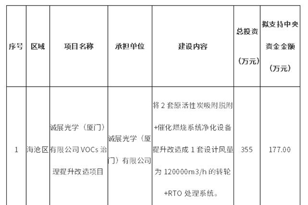 厦门市2024年中央大气污染防治资金(第二批)拟补助项目公示 根据《大气污染防治资金管理办法》(财资环〔2022〕106号)和《厦门市财政局关于下达2024年第二批中央大气污染防治资金预算的通知》(厦财预执指事〔2024〕25号)等有关规定,经审核,诚展光学(厦门)有限公司VOCs治理提升改造项目等6个项目符合补助要求,拟拨付中央大气污...